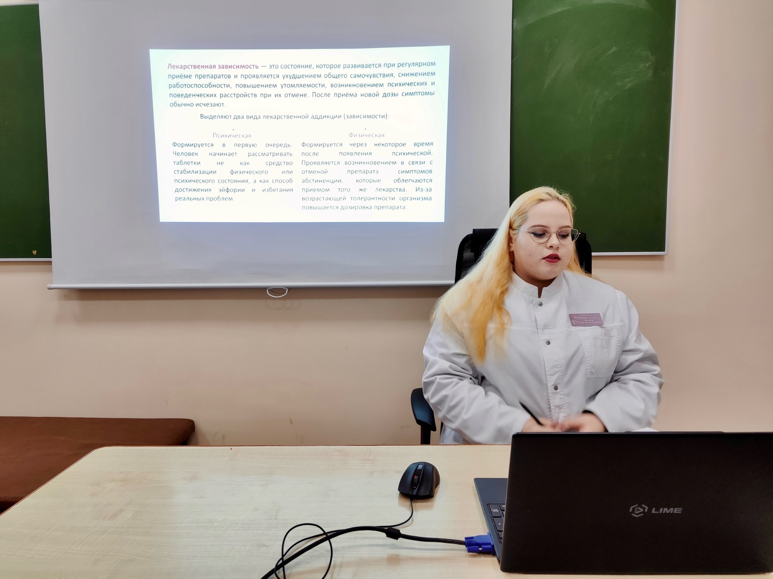 Тема второго доклада «Социальные последствия медикаментозной зависимости и пути социальной реабилитации пациентов», подготовил студент 22ллв2 Шалаева О.К.